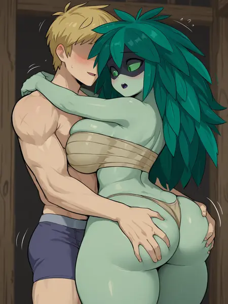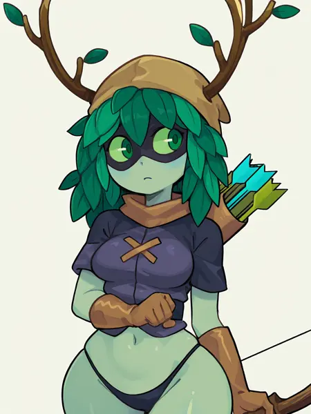 関連プロンプト: 色付き肌、緑色の肌、緑色の白目、緑色の目、緑色の髪、葉、ツノ、マスク
