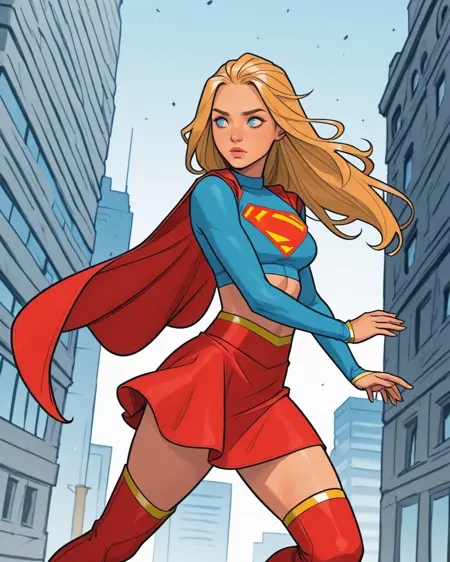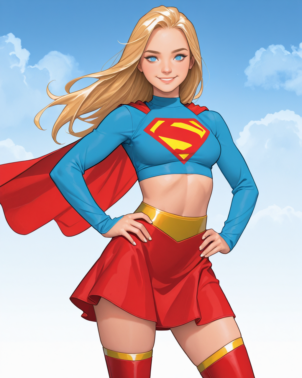 触发词:_newsupergirl, 1girl, 金发, 长发, 蓝眼, 短上衣, 斗篷, 露脐, 红裙, 大腿靴