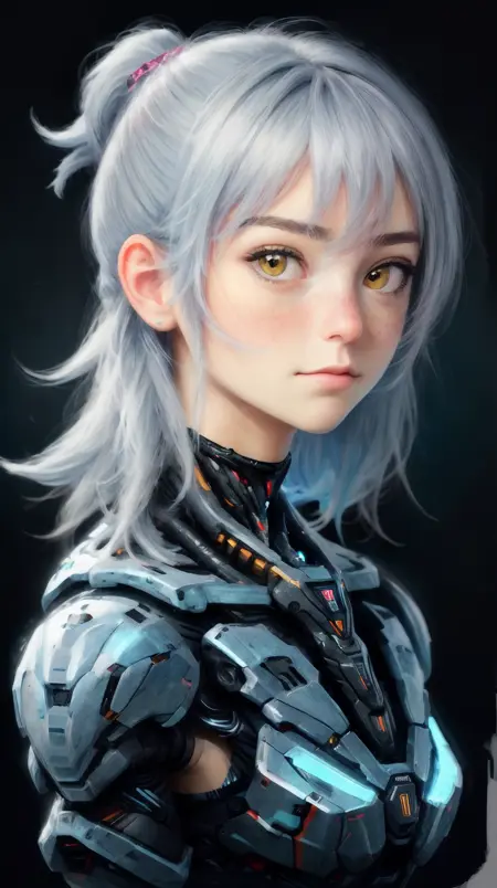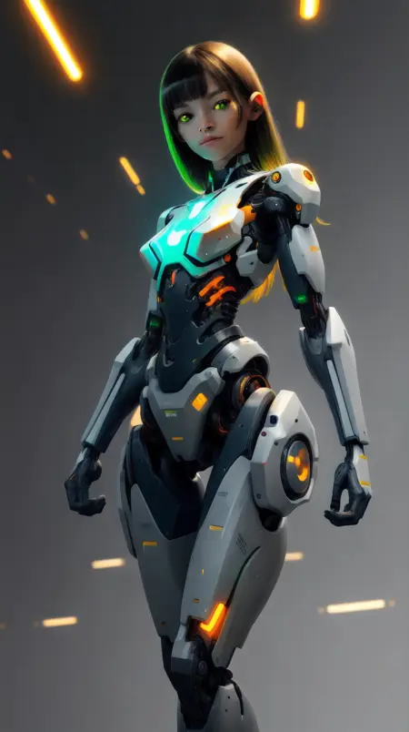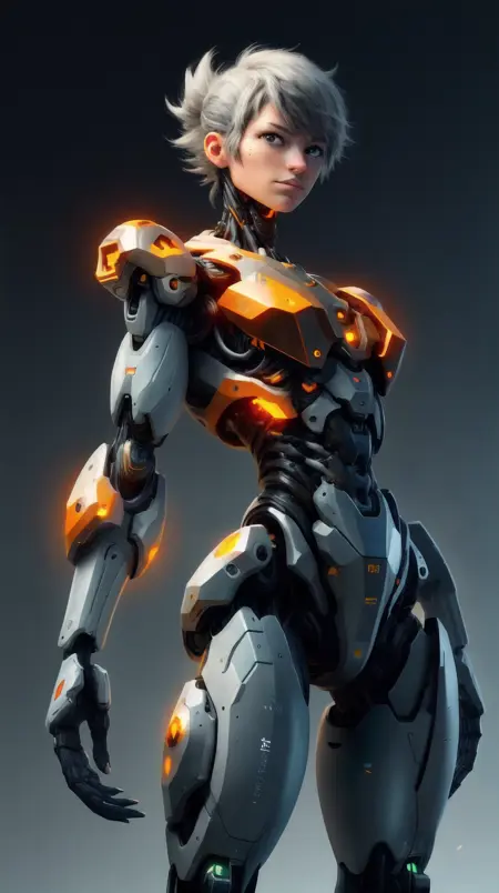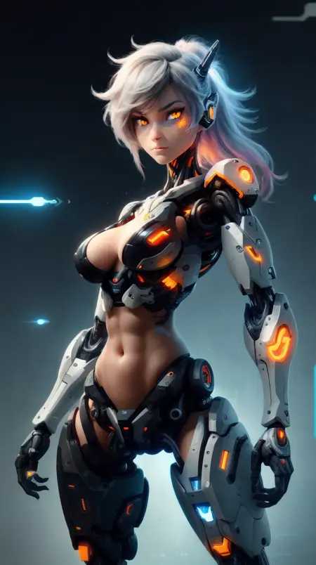 这是金属盔甲、霓虹灯和火焰的强力组合,搭配狂野的头发、裸露的身体和赛博增强装置。