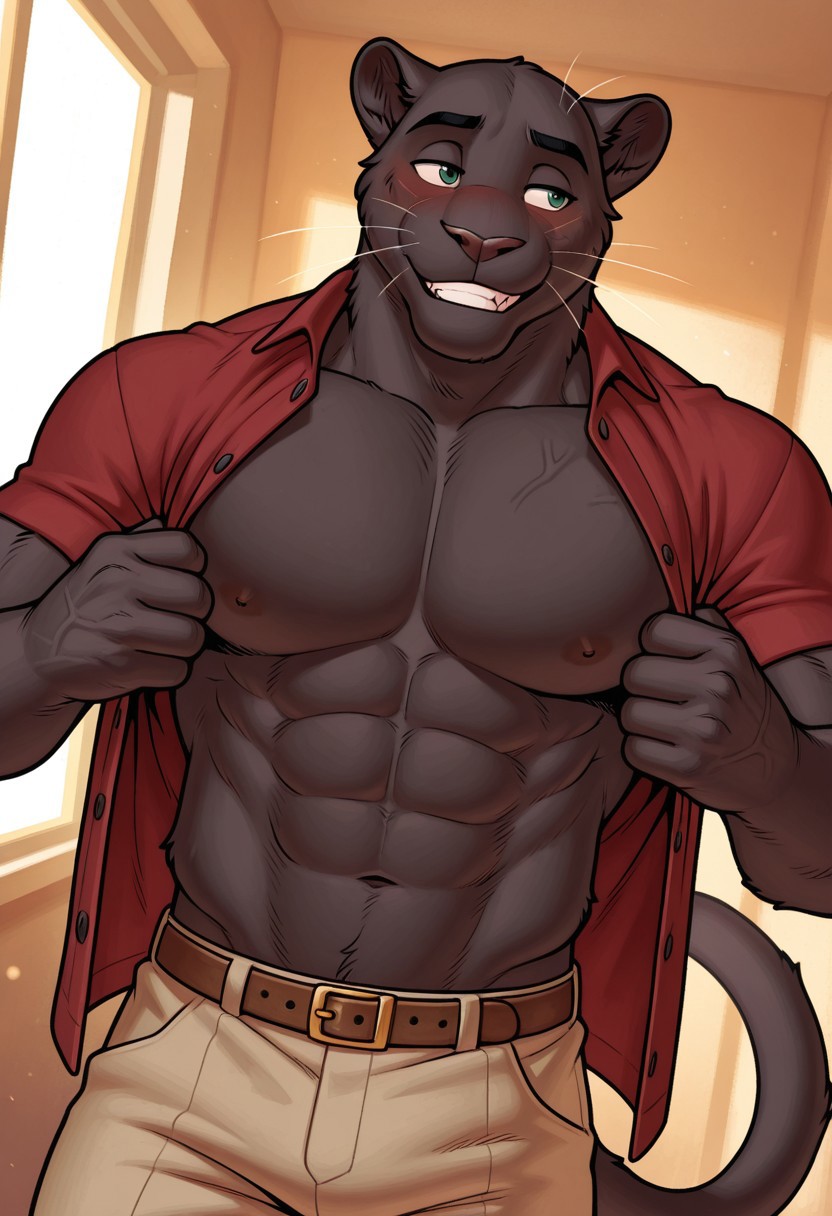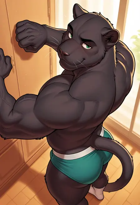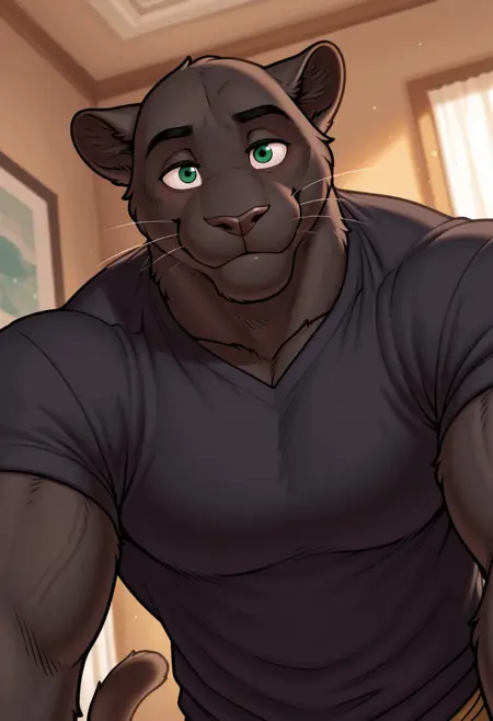강화 프롬프트: "피urry, 꼬리, 녹색 눈, 검은 털, 근육질, bara, 운동선수 같은 체형, 큰 근육, 남성적, 거대한 흉근"