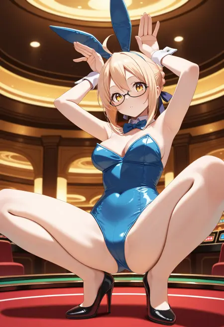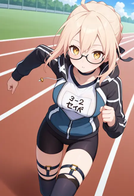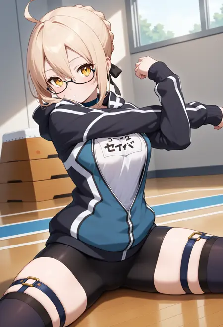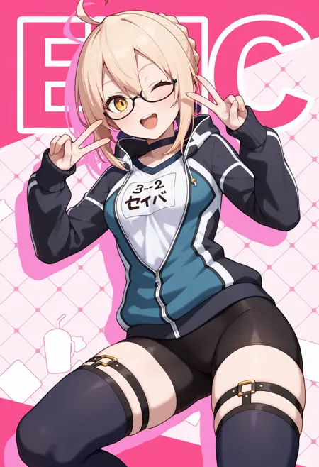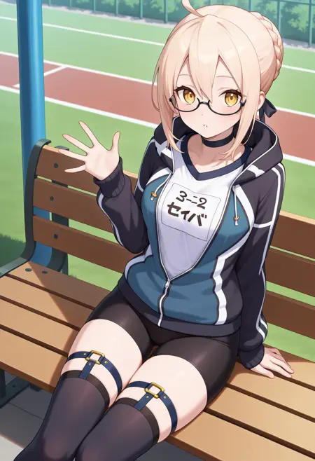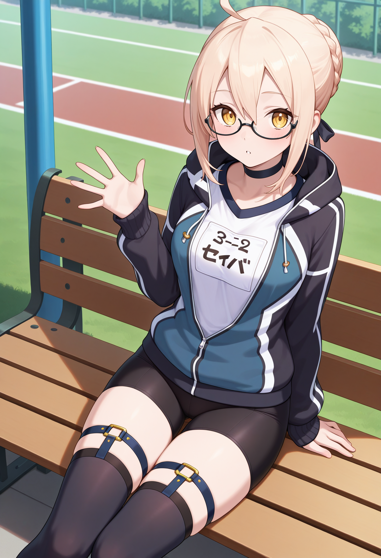 outfit2bbx, blonde hair, ahoge, braid, glasses, yellow eyes, black choker, gym uniform, name tag, white shirt, hooded track jacket, black jacket, long sleeves, bike shorts, black shorts, thigh strap, black thighhighs