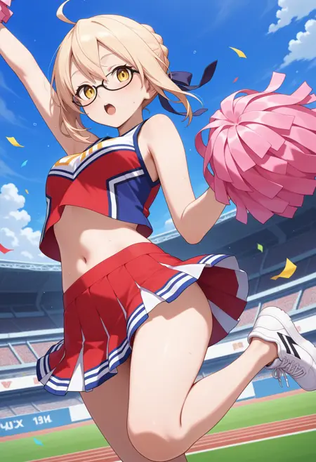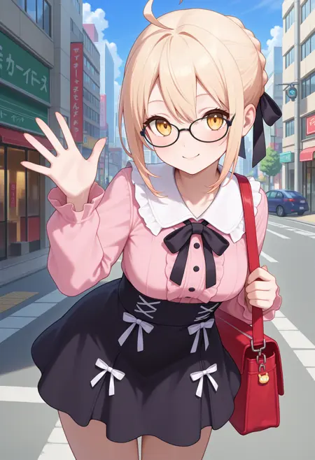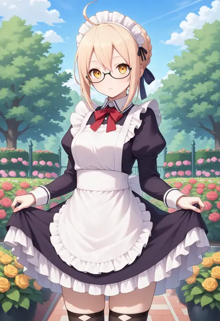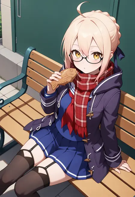 outfit1aax, blonde hair, ahoge, braid, hair ribbon, glasses, yellow eyes, school uniform, plaid scarf, red scarf, red neckerchief, blue shirt, hooded jacket, black jacket, long sleeves, pleated skirt, blue skirt, garter straps, black thighhighs