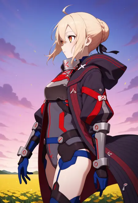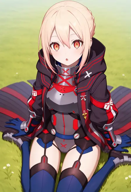 outfit3-1 (hood up)ccx, blonde hair, hood up, multicolored eyes, yellow eyes, red eyes, armor, breastplate, grey leotard, hooded coat, black coat, arm guards, blue gloves, garter straps, blue thighhighs