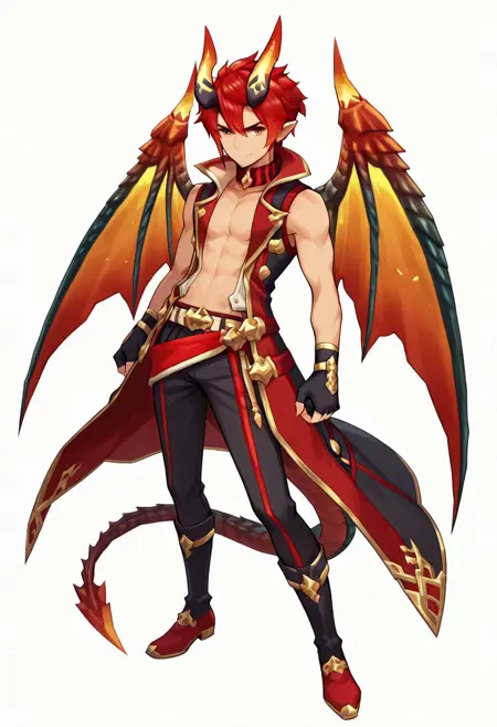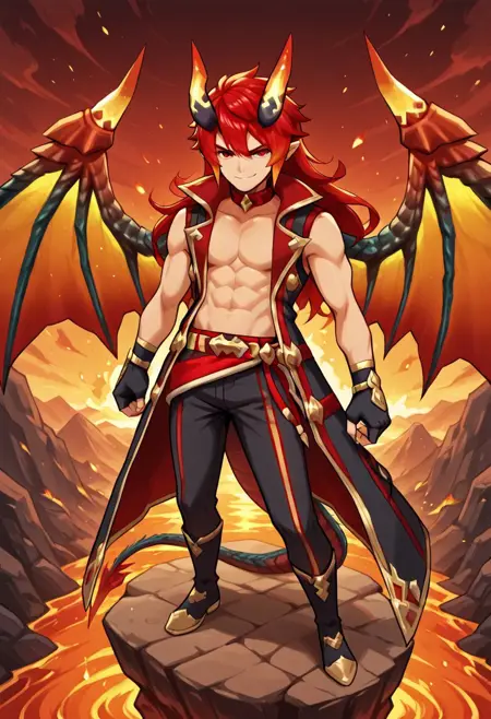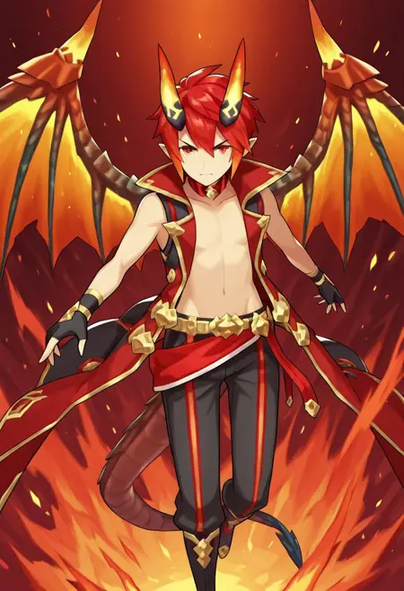 普罗米修斯,德拉格利亚失落,1个男孩,男性焦点,单独,龙,龙男孩,红发,红眼,红角,龙角,角,尖耳,龙翼,翅膀,龙尾,尾巴,鳞片,控火术,火焰,无袖,外套,黑色长裤,裤子,腰带,手套,黑色手套,露指手套,肚脐,