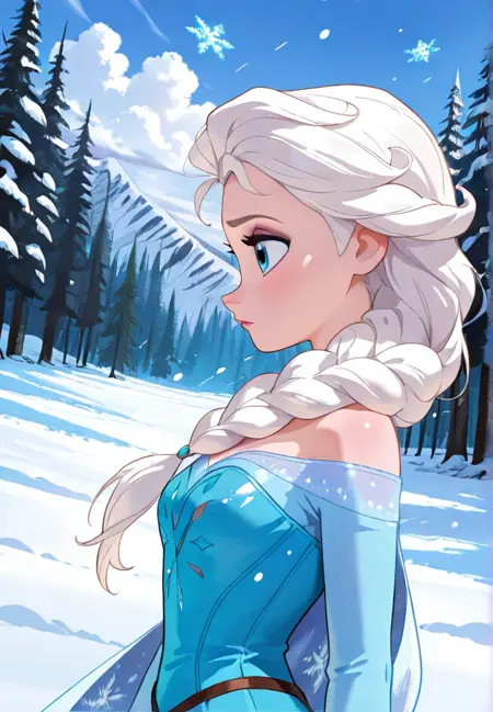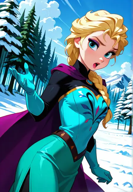 短い髪、青い目、プラチナブロンドの髪、編み込み、唇、化粧、リップスティック、紫のマント、ブローチ、アイシャドウ、そばかす、青い手袋、肘までの手袋、グリーンのスカート、王冠、笑顔、髪を上げたスタイル、