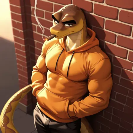 正面提示词:MRSK,毛茸茸的,野性的,鳞片状的,蛇,黑色眉毛,黑色眼睛,棕色身体,棕色鳞片,黄色身体,黄色鳞片,双色身体,双色鳞片