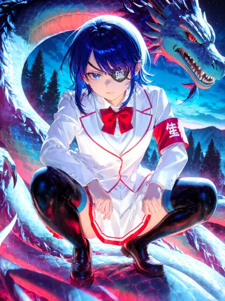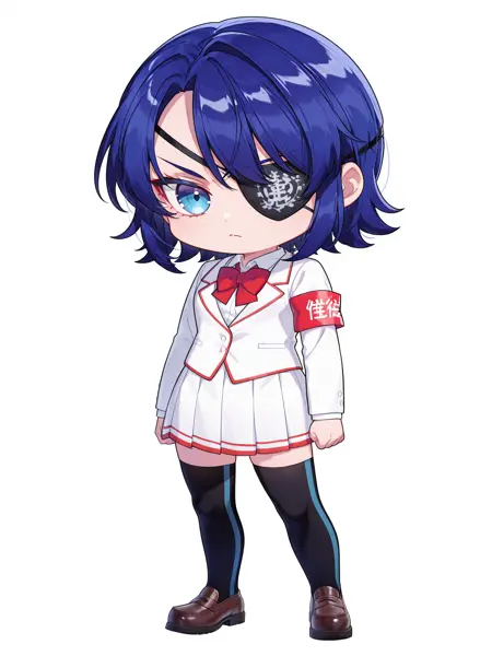 white school uniform, red bowtie, armband, pleated skirt, black pantyhose, loafers