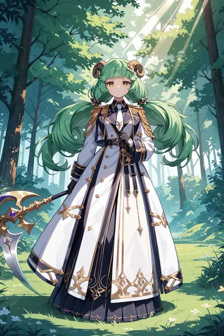 갑옷: 관모, 보석, 녹색 드레스, 갑옷 드레스, 어깨 노출, 잠금뼈, 가슴 선, 검은 장갑, 갑옷 스커트, 검은 신발, 허벅지 부츠, 갑옷 부츠