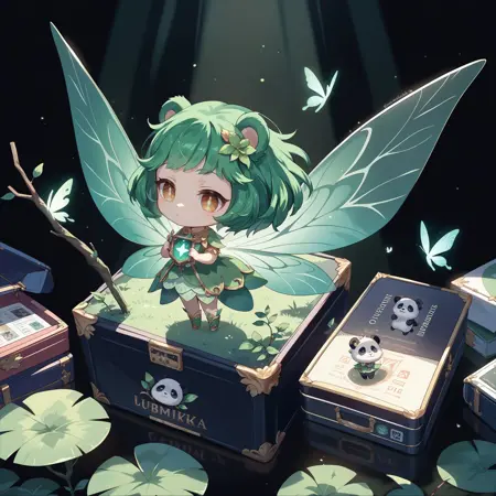 중국: 머리 장식, 머리 꽃, 빨간 꽃, 중국 드레스, 녹색 드레스, 짧은 소매, 가슴 선 절개, 하트 절개, 보라색 리본, 팔찌, 숄더백, 인형 판다, 녹색 허벅지 양말