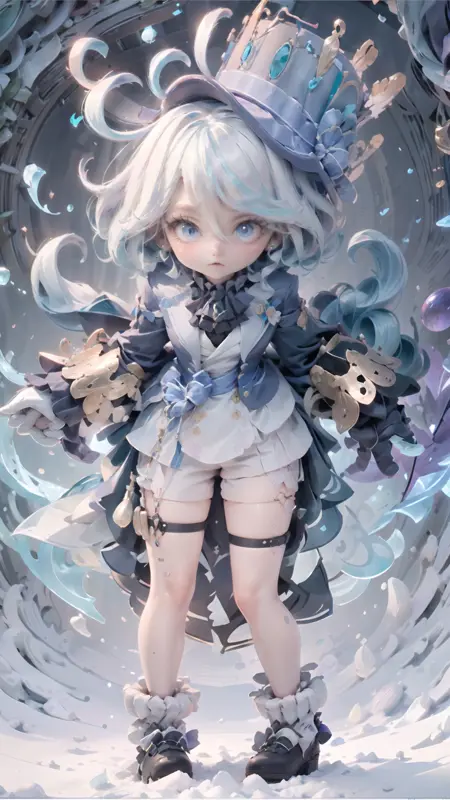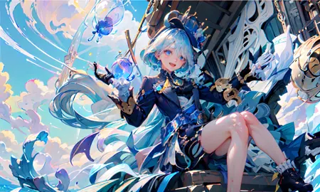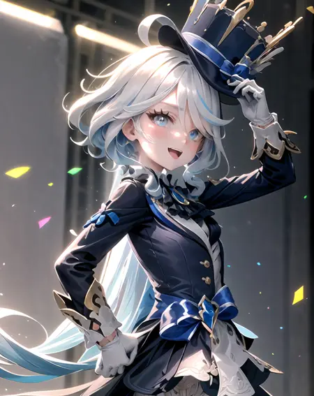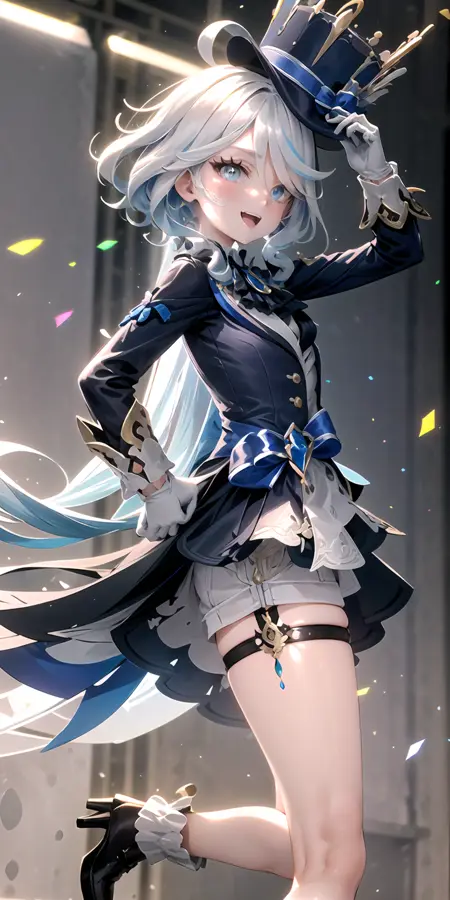 推荐选取以下提示词引用会有更好的还原度,不用的话创作上也很有趣 "furina \(genshin impact\)\, chain,frilled sleeves,shorts,blue bow,bowtie,long sleeves,frills,high heels,(blue headwear)+(mini hat:1.2),crown,blue footwear,blue bowtie,blue jacket,shirt,jewelry,jacket,(black footwear)+(blue footwear bow),white socks,vision \(genshin impact\),gem,(light blue hair)+(white hair)+(long hair)+(bangs)+(ahoge),(gloves)+(half gloves)+(left hand white gloves)+(right hand black gloves),(left hand white gloves:1.4),(heterochromatic:1.3)+(right eye light blue,)+(left eye purple:1.4),