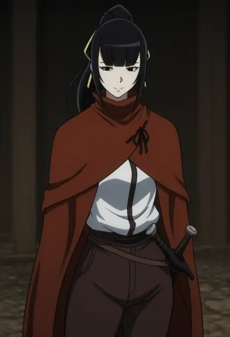 触发词 = zznarberalzz,标签 = 1girl, black hair, solo, ponytail, long hair, ribbon, hair ribbon, bangs, blunt bangs, black eyes, anime coloring, cloak, cape, sheath, red cape, pants