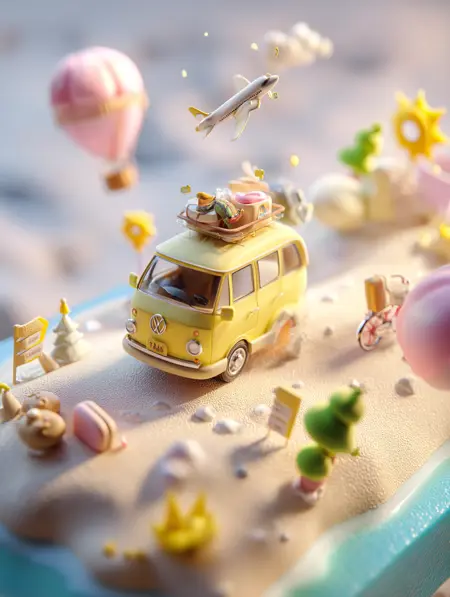 - 短い金髪のトレンドな3Dアニメ風少女。緑色のヘッドホンと丸いサングラスを着用し、ピンクのキャミソールとゆったりした緑色のパンツを着ている。スマートフォンを操作しながら椅子に座り、色鮮やかなデジタル環境に囲まれている。周囲にはカラフルな抽象的な泡や遊び心のある形状、浮遊するアイコンが広がり、おもちゃのような滑らかな質感。パステルとネオンカラーのパレットで、リラックスした現代的な雰囲気。明るく柔らかな照明とクリーンな影。正面からの構図。Gen Zのデジタルライフスタイルの美学