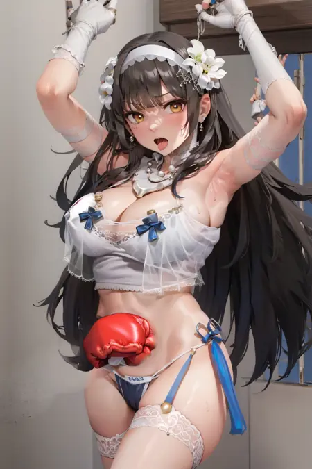ストレートな前髪、黒髪、非常に長い髪、白いヘアバンド、髪の花、髪飾り、ネクタイ、サイドスリット、白いドレス、チャイナドレス、中国風の衣装、ブラ、青いリボン、ブラックのパンティーストッキング、胸の間