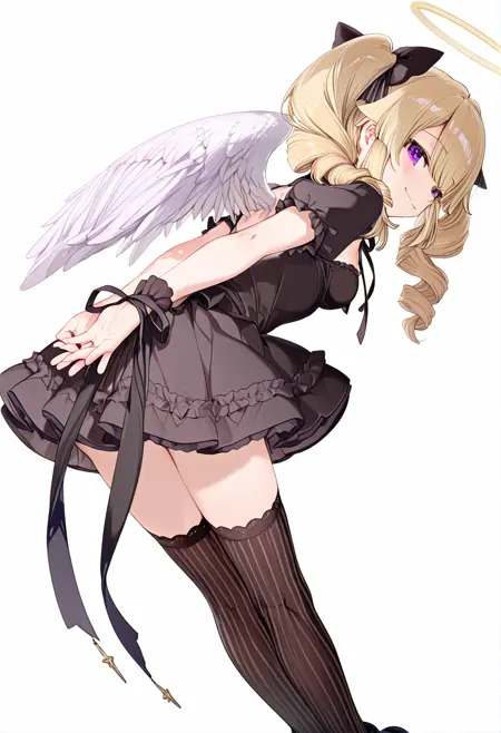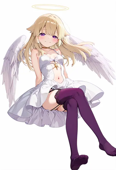 white dress,angel, garter straps, feathered wings, navel, angel wings,hair flaps, purple thighhighs,