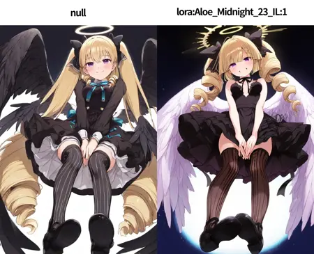 wings, dress, striped thighhighs, vertical-striped thighhighs, striped, black dress, full body, drill hair, feathered wings, black footwear, halo, twin drills, twintails, v arms, black thighhighs, black chocker ribbon