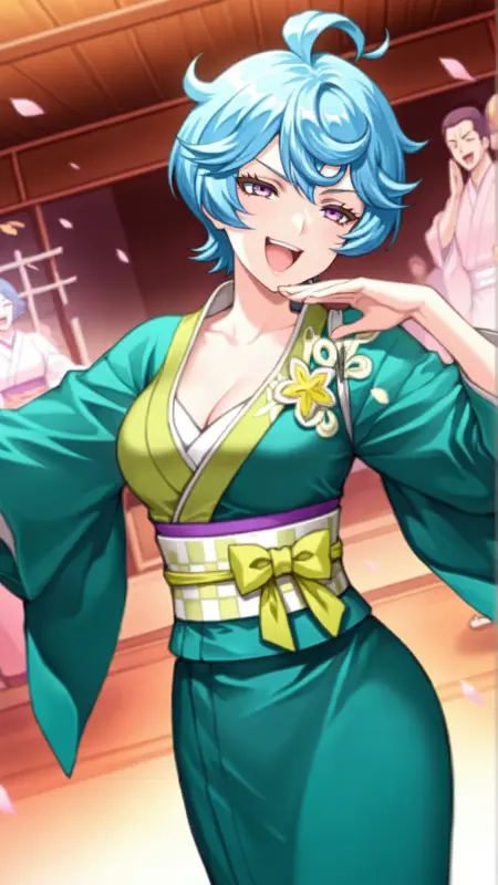 衣装:胸元、キャンディーケーン、帽子の先端、緑のボディスーツ、チョーカー、ハイヒールブーツ、帽子の羽根、