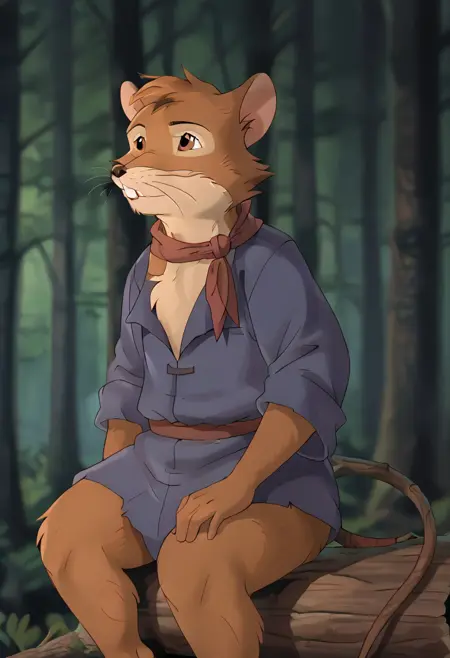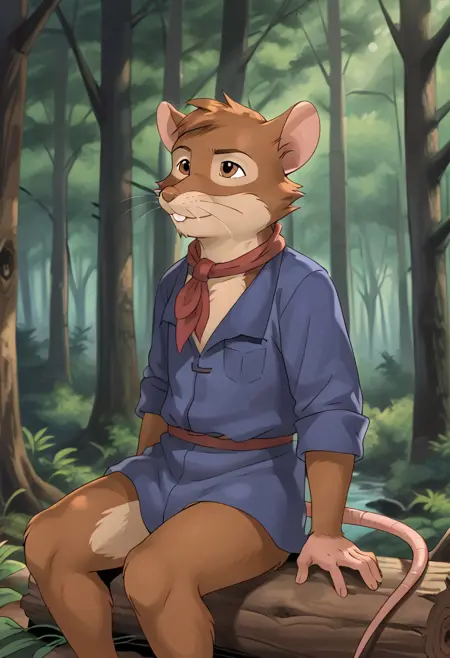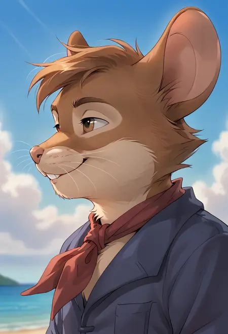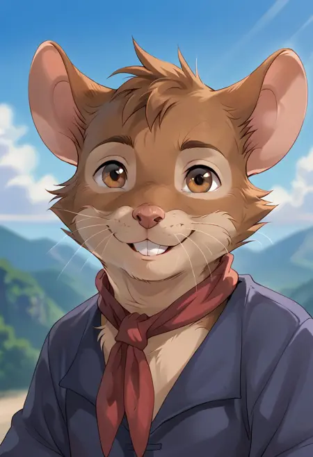 1boy, male, animal, furry, mouse, mouse ears, mouse tail, brown eyes, buckteeth, brown fur, blue shirt, red kerchief,