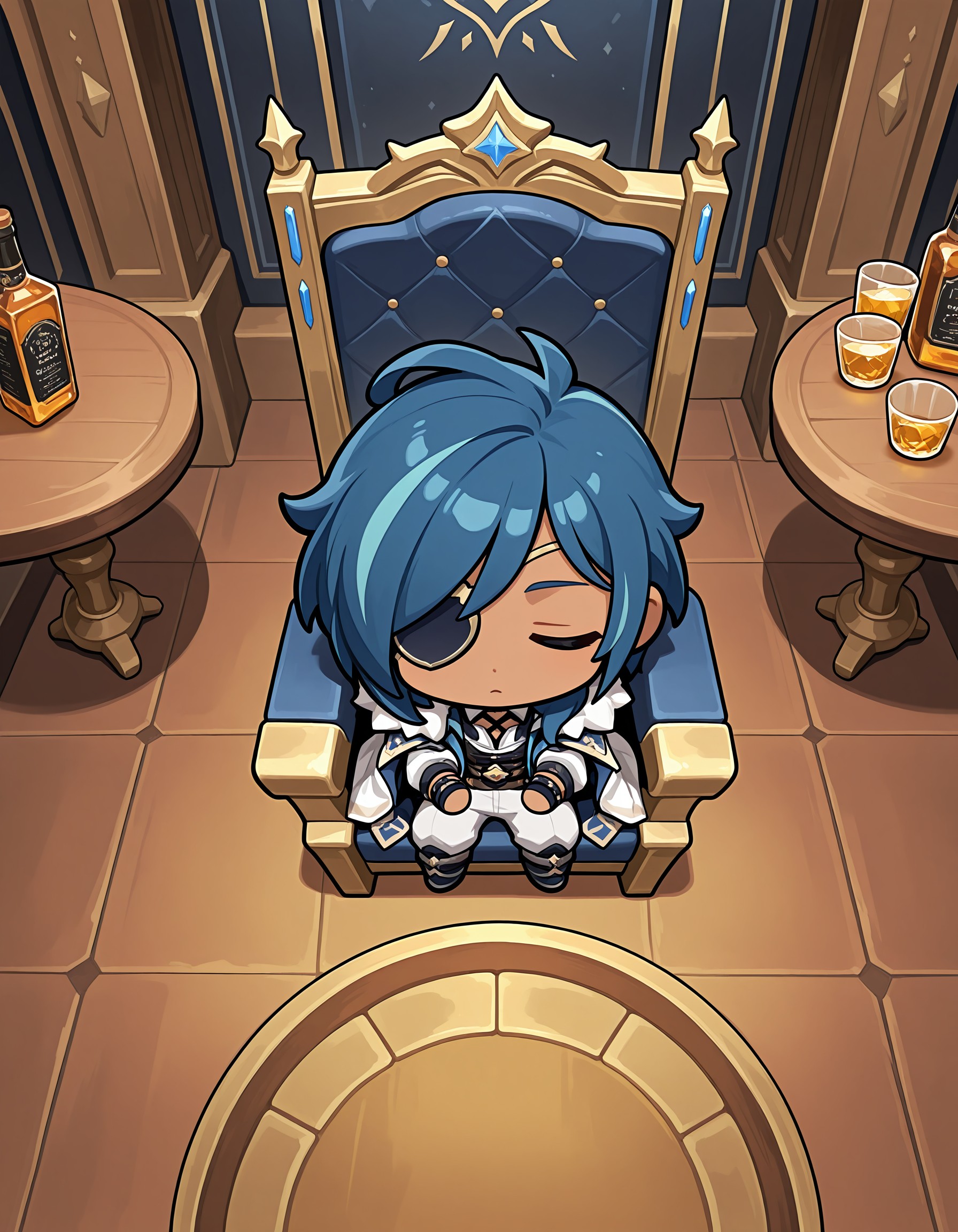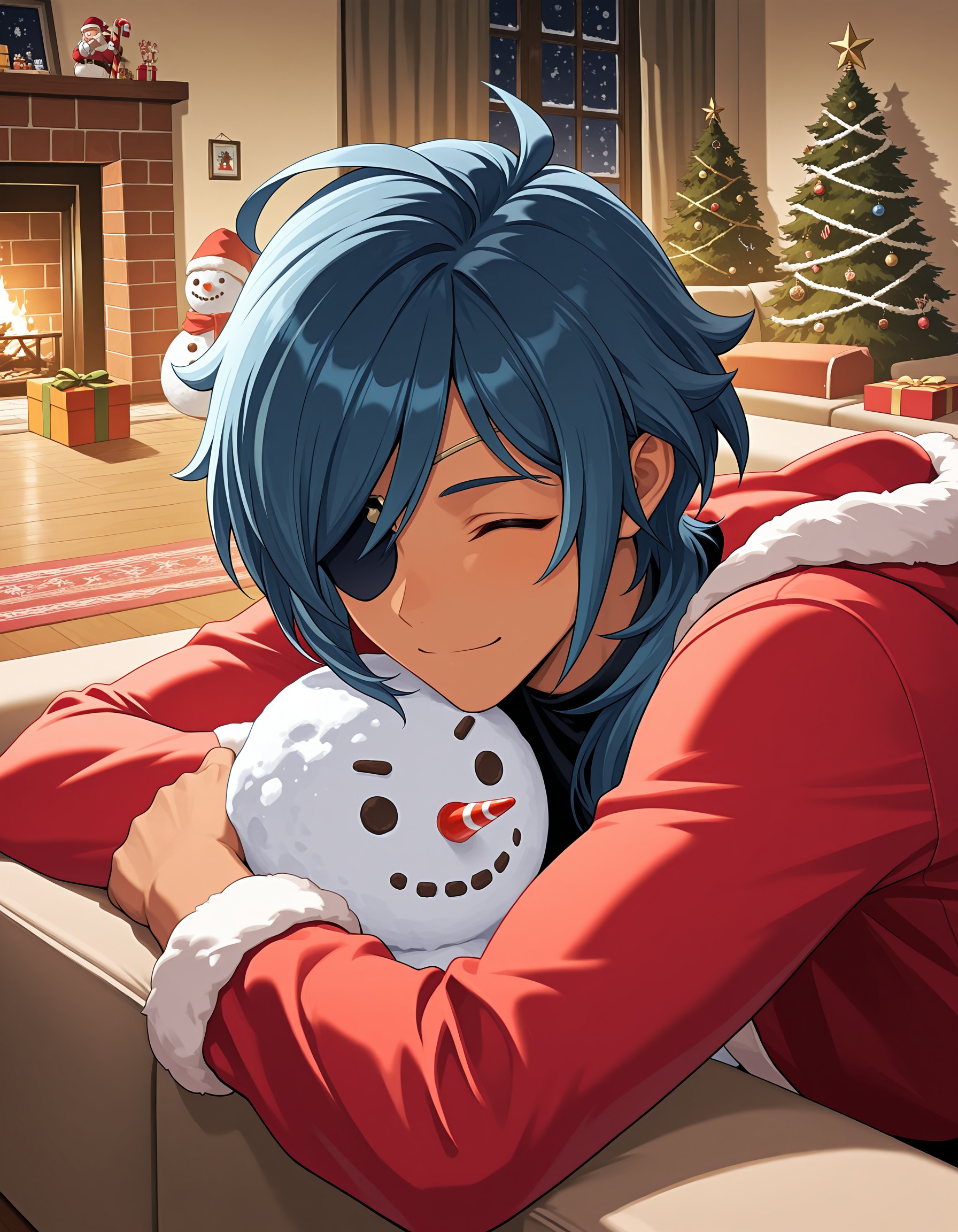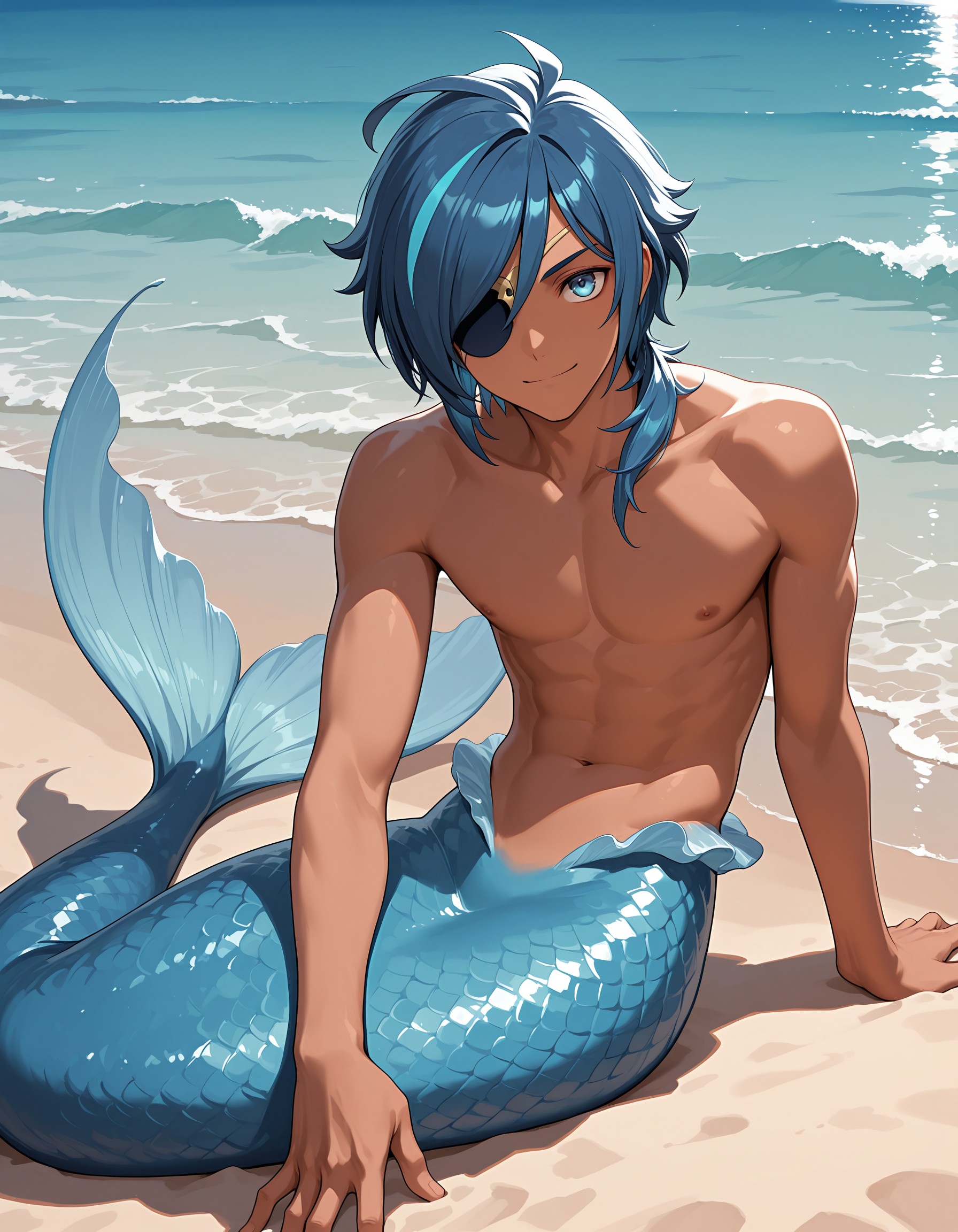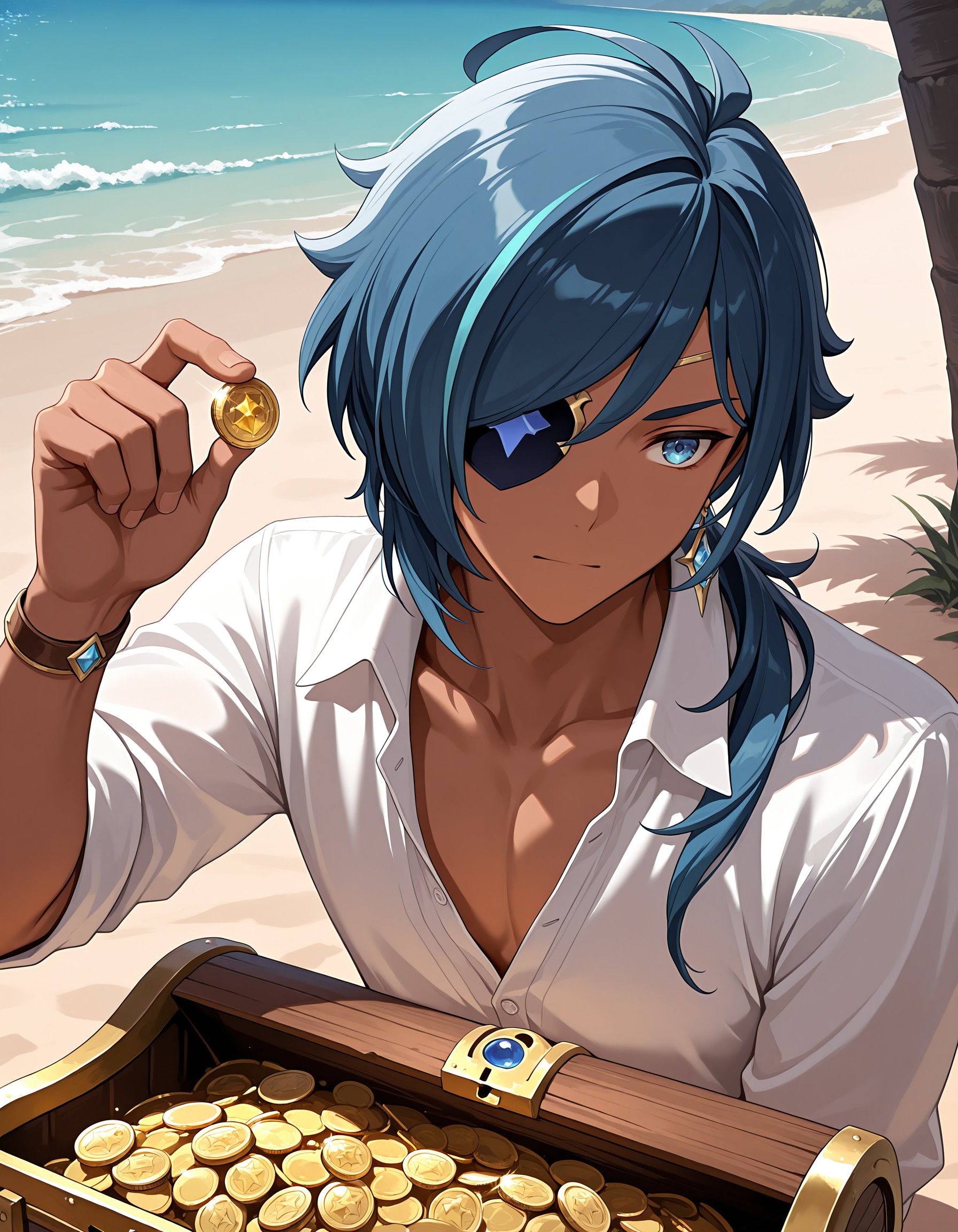 ky_abr, blue hair, blue eyes, male focus, dark skinned male, eyepatch