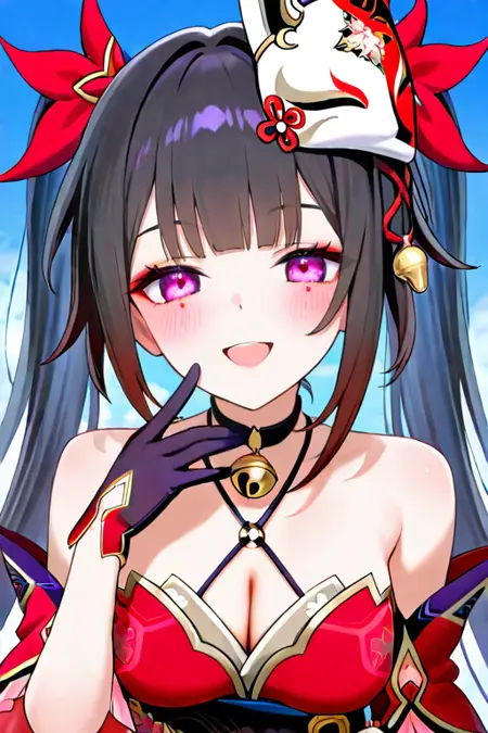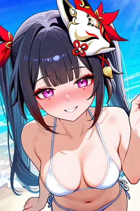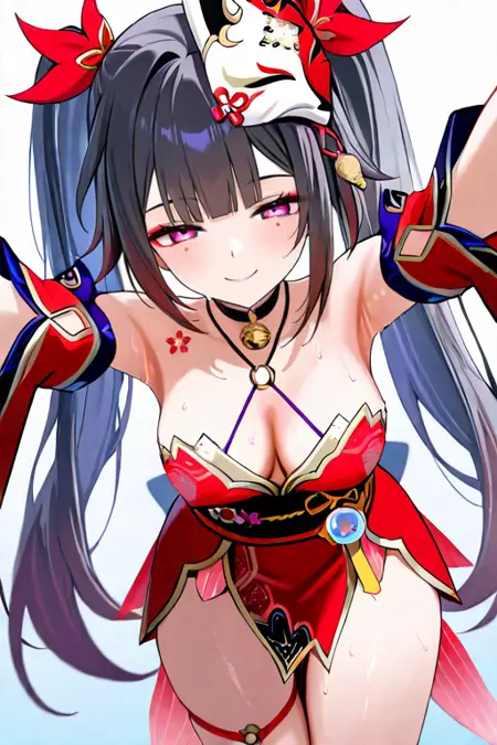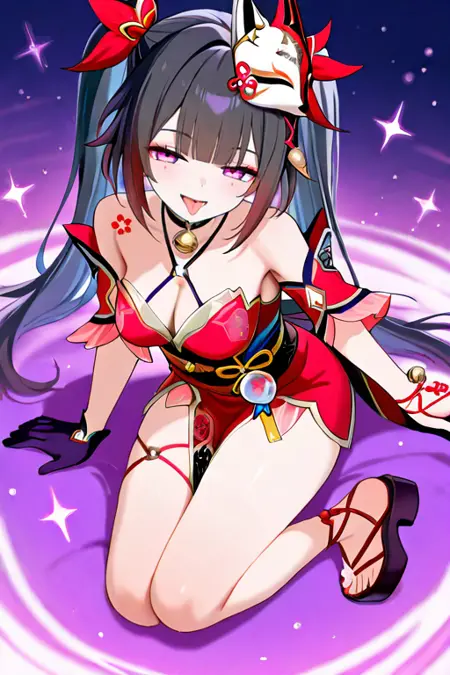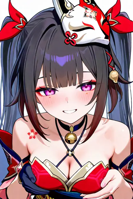 1个女孩,单人,hdsparkle,双马尾,铃铛,黑发,头上戴面具,狐狸面具,紫色眼睛,妆容,微笑,