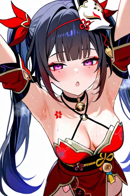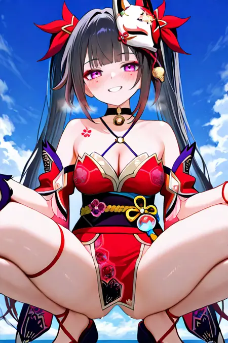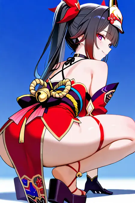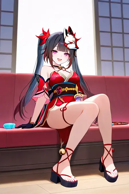 中等胸部,sparkledef,露肩,无袖连接,黑色项圈,交叉式吊带,吊颈装,露胸,短和服,红色连衣裙,黑色腰带,腰带,单只手套,黑色手套,胯部帘布,大腿绑带,厚底鞋,木屐,