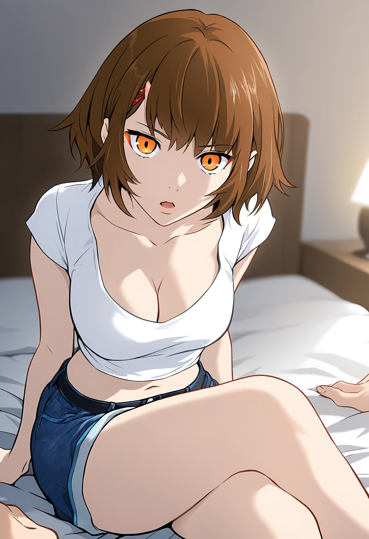 endorsi, short hair, blunt bangs, brown hair, orange eyes, hairclip, single horn,