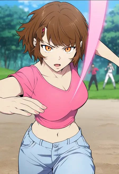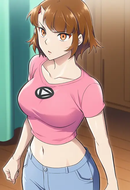 midriff, pink shirt, navel, pants, breasts,