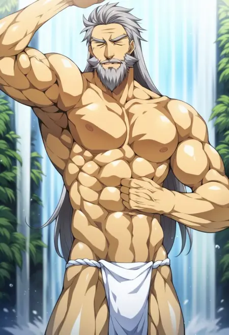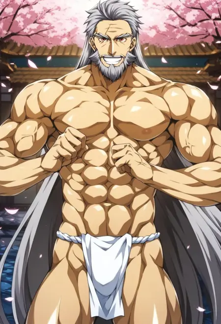 Senzaemon, Long hair, Grey Hair, Beard, Muscular, Red Eyes