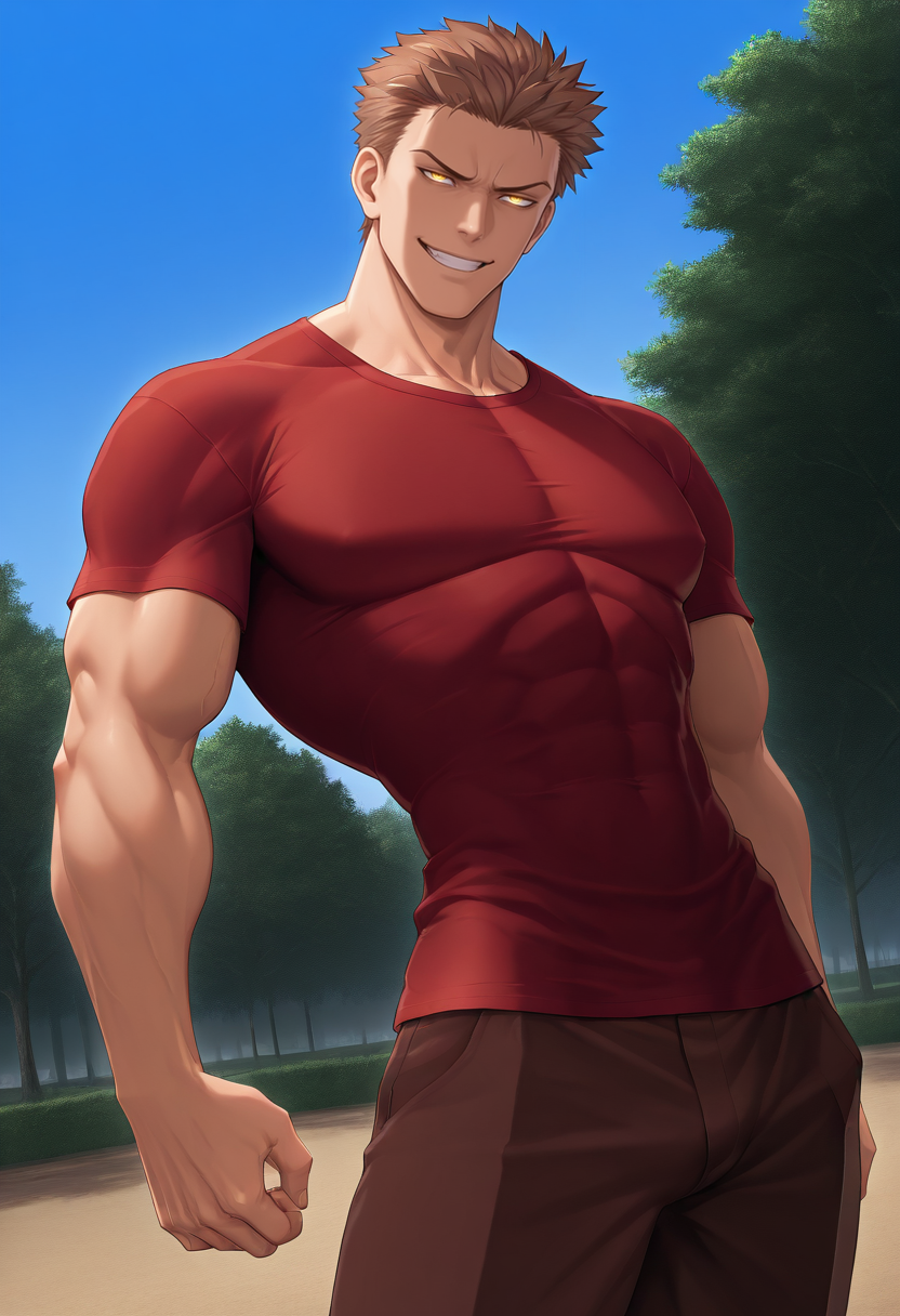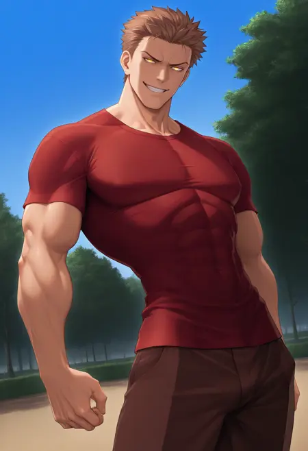 사사야마: 1boy, sasayama. 연한 갈색 머리, 꼬불꼬불한 짧은 머리, 빨간 스판 티셔츠, 갈색 바지, 근육질, 연한 갈색 눈,