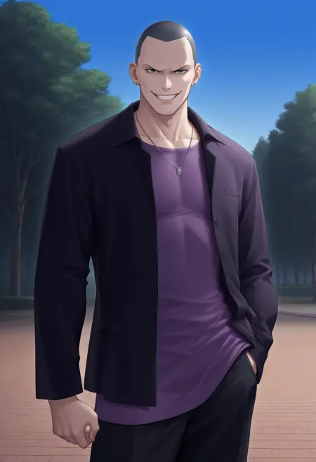 아부쿠마: 1boy, abukuma, 검은 머리, 대머리, 검은 눈, 귀에 구슬, 연한 보라색 셔츠, 검은 자켓, 목걸이,