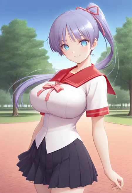 아야메 모리사키: 1girl, ayame, 연한 보라색 머리, 아쿠아 눈, 폰티테일, 긴 머리, 학교 유니폼, 빨간 해적 칼라, 분홍색 가슴 리본, 짧은 소매, 검은 접힌 치마, 미니 치마,