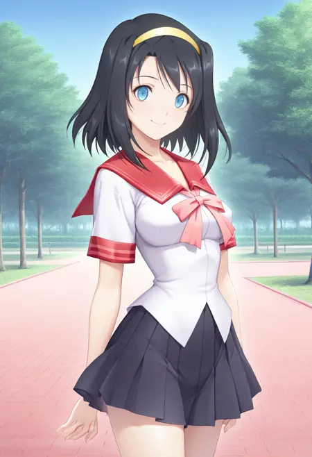 마유 아케히메: 1girl, mayu, 검은 머리, 짧은 머리, 연한 녹색 눈, 노란 헤드밴드, 학교 유니폼, 빨간 해적 칼라, 분홍색 가슴 리본, 짧은 소매, 검은 접힌 치마, 미니 치마,