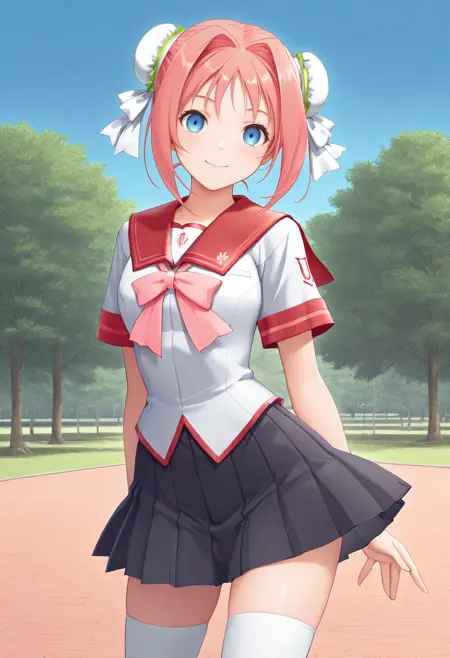 미쿠 아키야마: 1girl, miku, 분홍색 머리, 파란 눈, 짧은 머리, 머리 뭉치, 학교 유니폼, 빨간 해적 칼라, 분홍색 가슴 리본, 짧은 소매, 검은 접힌 치마, 미니 치마, 흰색 허벅지 스타킹,