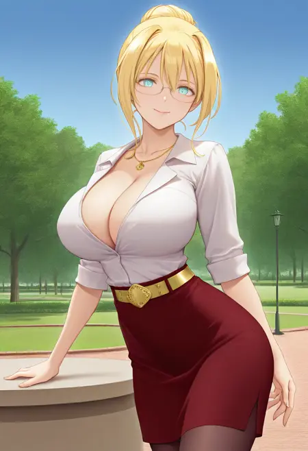 크리스 아케히메: 1girl, chris, 금발, 앞머리, 머리 뭉치, 연한 녹색 눈, 안경, 흰색 셔츠, 가슴 노출, 금색 벨트, 금색 목걸이, 진한 빨간 치마, 팬티스타킹,