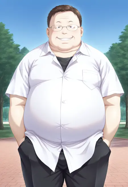 시게루 누마지리: _1boy, shigeru, 갈색 머리, 짧은 머리, 안경, 통통한, 흰색 짧은 소매 셔츠, 검은 바지, _