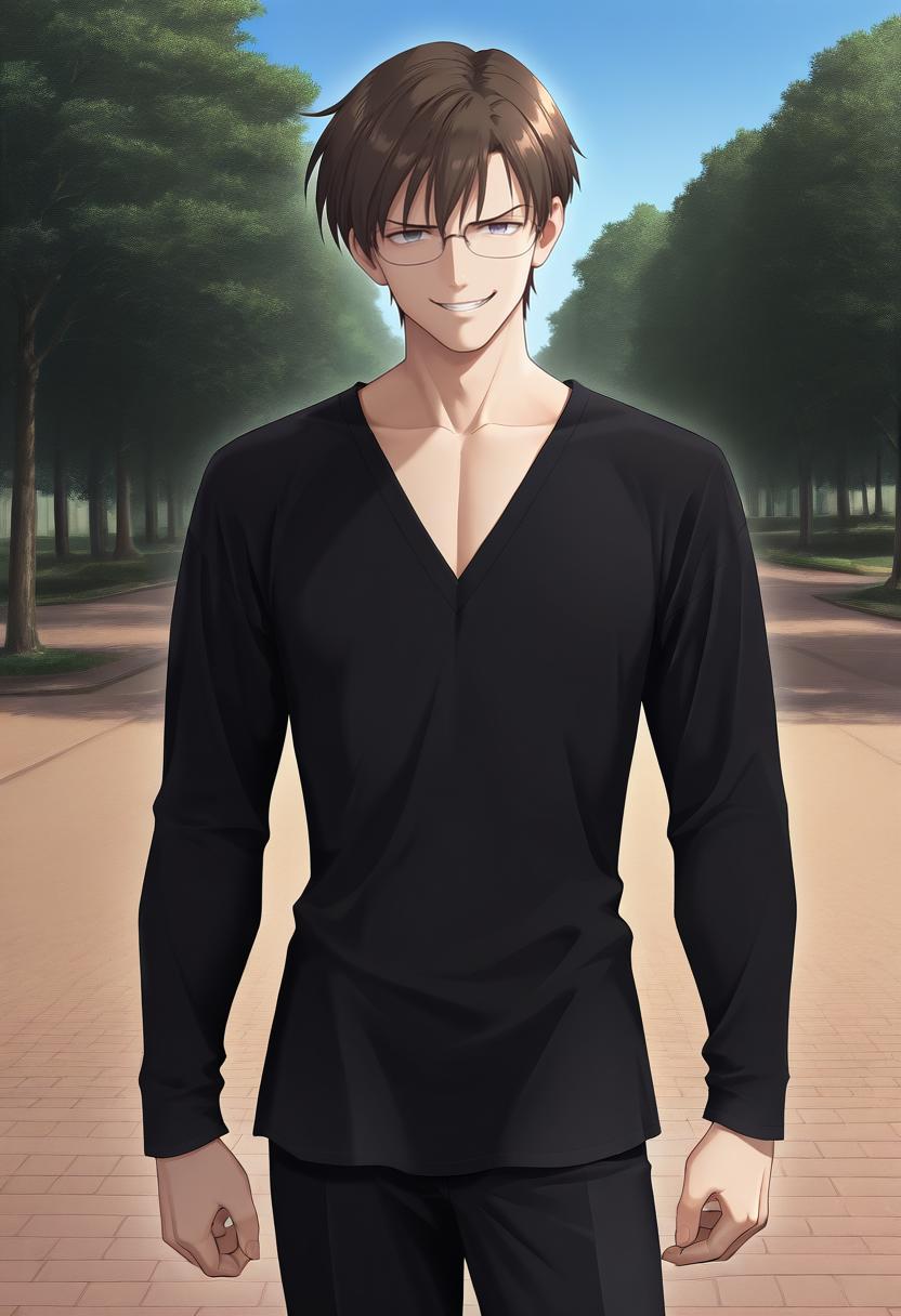 토야 츠게: 1boy, toya, 짧은 머리, 갈색 머리, 갈색 눈, 안경, 검은 긴 소매 셔츠, 검은 바지, 가슴 노출,