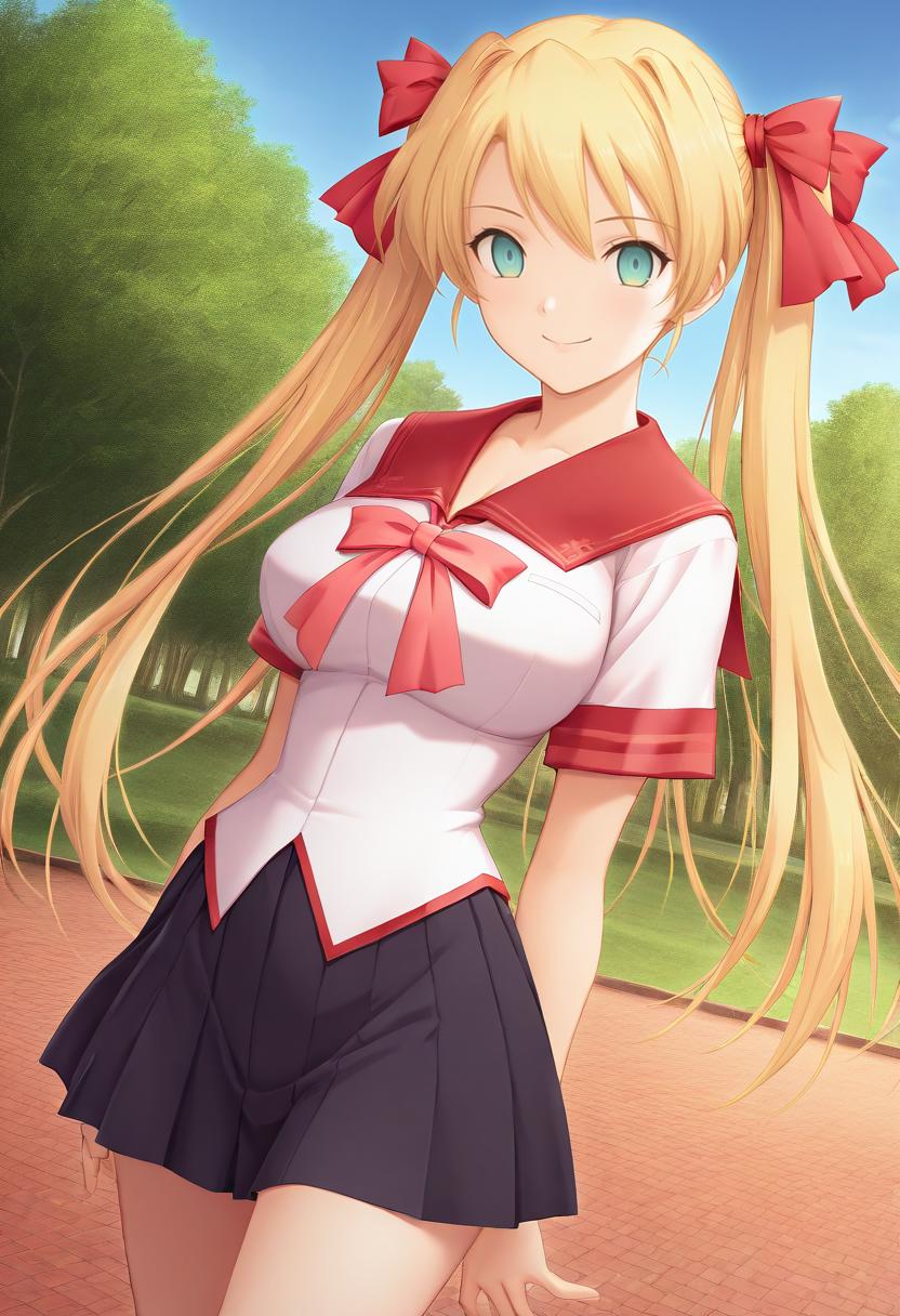 사키 아케히메: 1girl, saki, 연한 녹색 눈, 금발, 더블테일, 긴 머리, 빨간 머리리본, 학교 유니폼, 빨간 해적 칼라, 분홍색 가슴 리본, 짧은 소매, 검은 접힌 치마, 미니 치마,