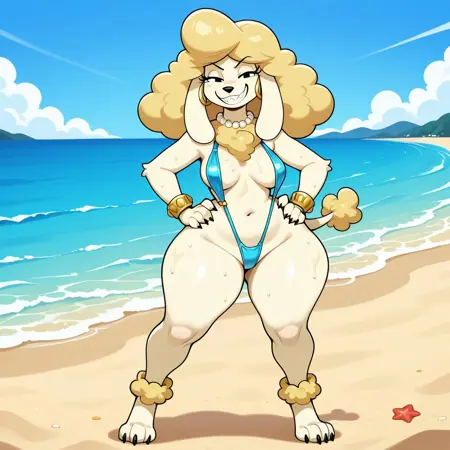 Solo, 1girl, feral, dog, poodle, white and yellow fur, blonde hair, black eyes, black nose, dog ears, dog tail, fluffy tail tip, fluffy ankles, fluffy bodice, claws, thick thighs, large ass, hoop earrings, pearl necklace, gold bracelets,