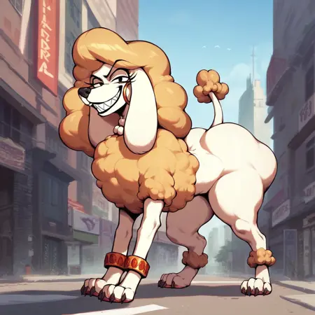 dog, poodle, white and yellow fur, blonde hair, black eyes, black nose, dog ears, dog tail, fluffy tail tip, fluffy ankles, fluffy bodice, claws, thick thighs, large ass, hoop earrings, pearl necklace, gold bracelets,