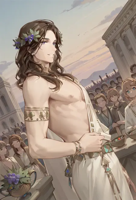 210(p),mature male,brown hair,belt,hair ornament,bracelet,food-themed hair ornament,parted bangs,