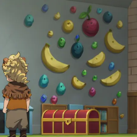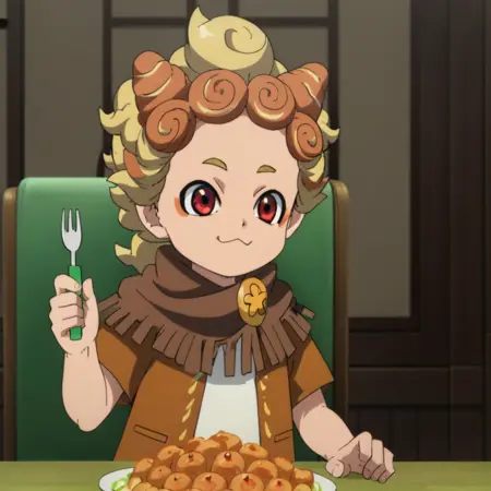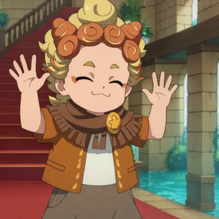 提示:男性,矮小角色,五彩头发,卷发,金发,橙发,辫子,红眼,眼影,围巾,棕色衬衫,白色衬衫,敞开的衣物,短袖,裤子,靴子,室内(城堡/楼梯/红地毯/藤蔓/盆栽/水),室内(休闲室/显示器/键盘(电脑)/椅子/宝箱/书架/攀岩墙/水果),室内(餐厅/餐桌/餐椅/盘子/食物),室内(走廊),室内(游乐场)