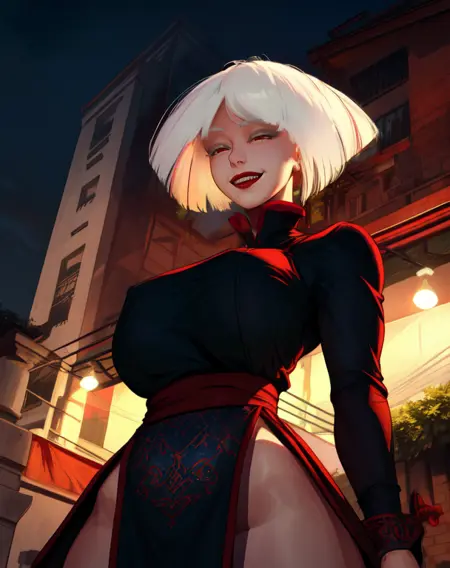 AKI, white hair, pink or purple eyes, red lips, or lipstick,