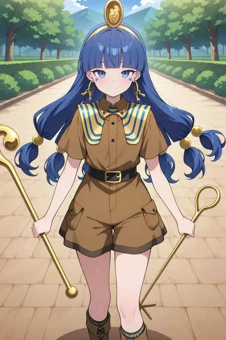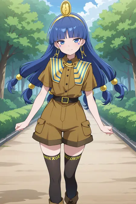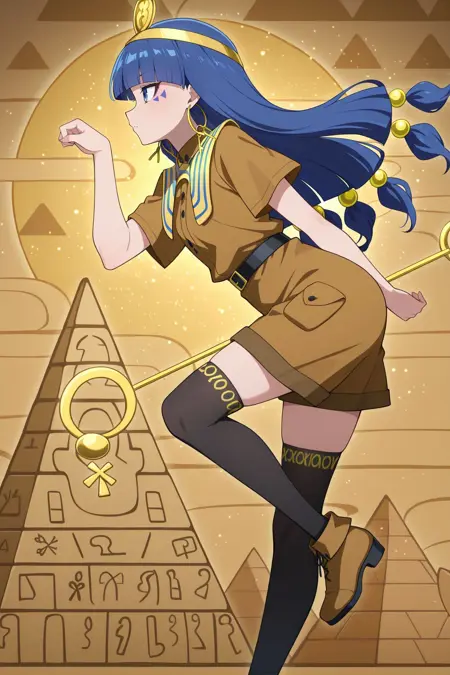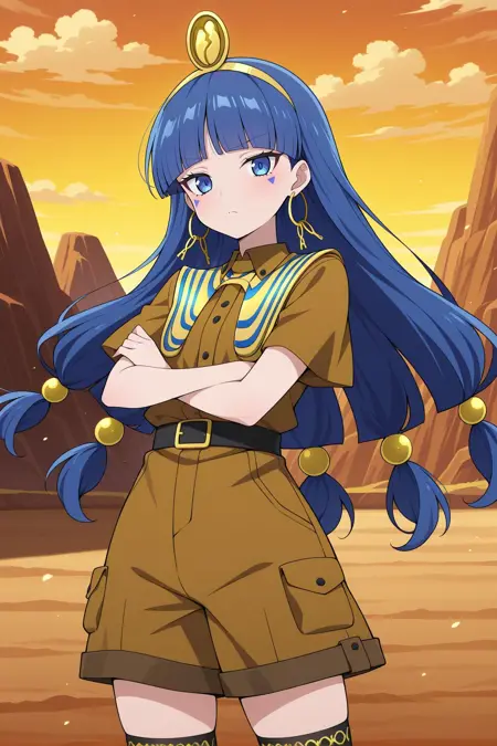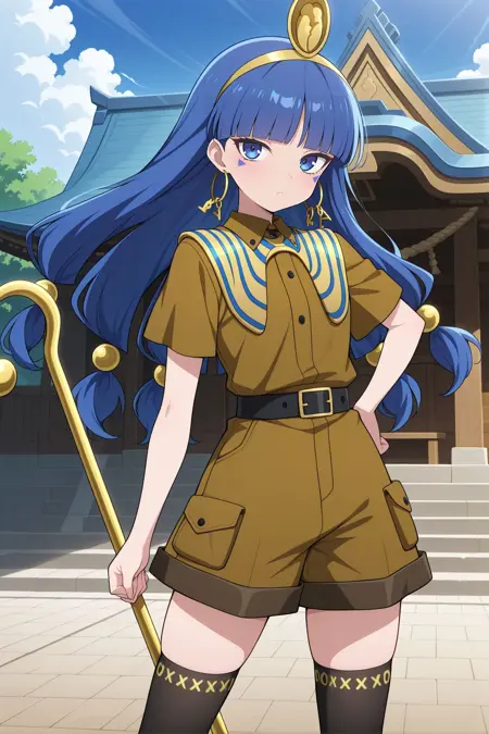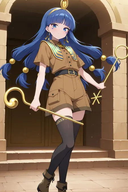 gold headdress, hair ornament, hoop earrings, usekh collar, gold jewelry, brown shirt, gold armlet, brown shorts, black thighhighs, brown boots,