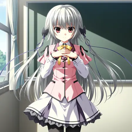 school uniform, yellow bowtie, white shirt, pink jacket, collared jacket, short over long sleeves, shoulder ribbon, black ribbon, white skirt, frilled skirt, black pantyhose, miniskirt,