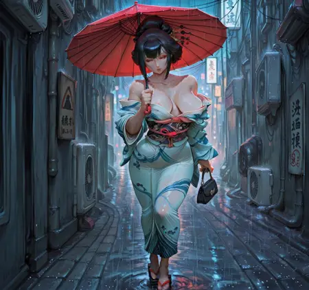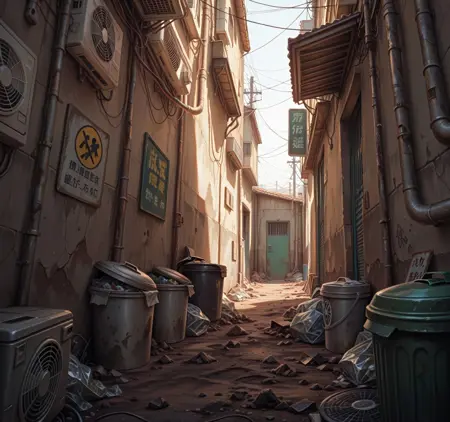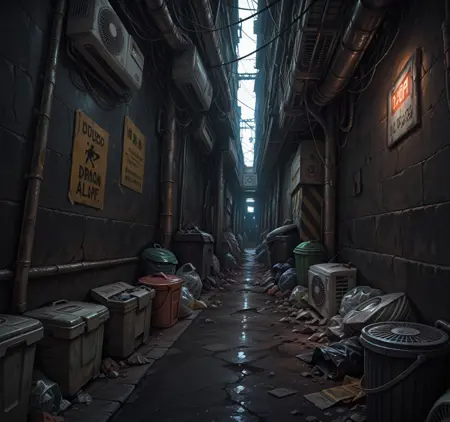As for triggers, word alley tends to get a wider back alley and narrow alley more narrow one. Add to them other descriptive words like clutter, city, building, street, bicycle, outdoors, trash can, car, air conditioner, night, day, tree, plant, industrial pipe, power lines, cable, light, street lamp, sign, graffiti, poster, and so on...