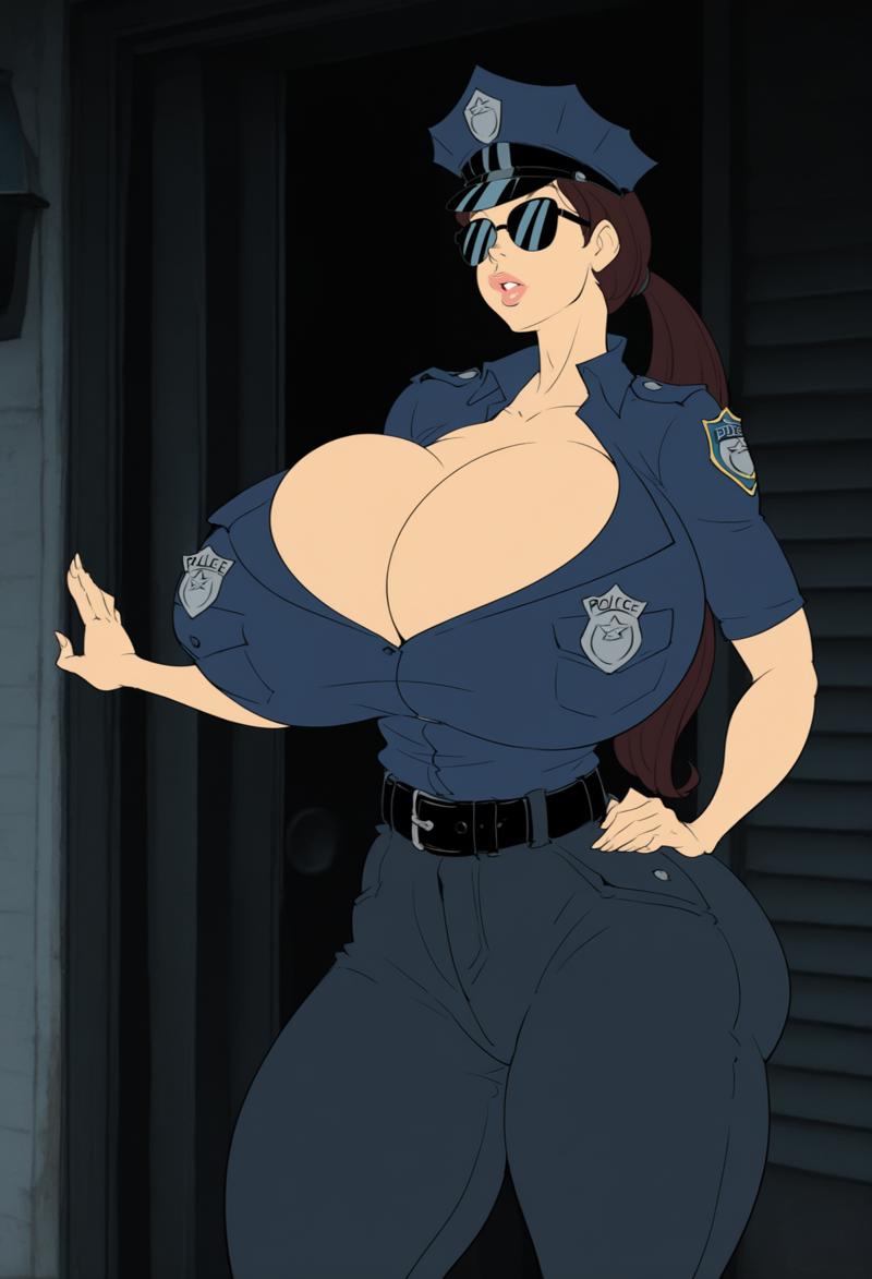Officer Juggs,1girl,solo,brown hair,huge breasts,long hair,ponytail,thick thighs,no bangs,