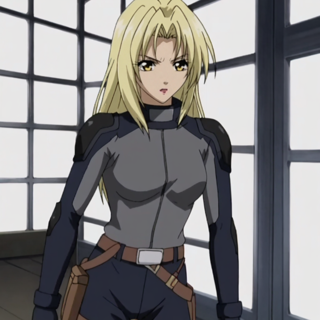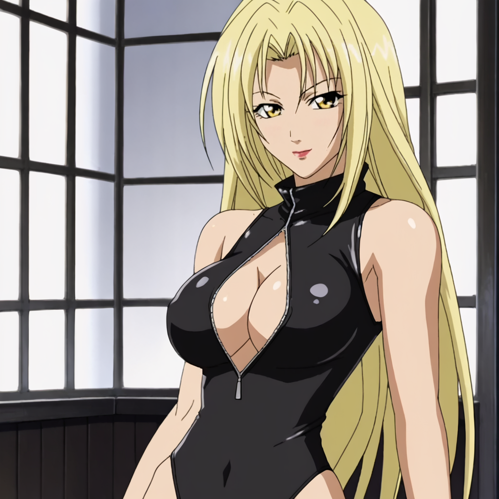 - 바디수트 트리거: HevnBodysuit, 1girl, 금발 머리, 노랑색 눈, 바디수트, 벨트, 카우보이 샷