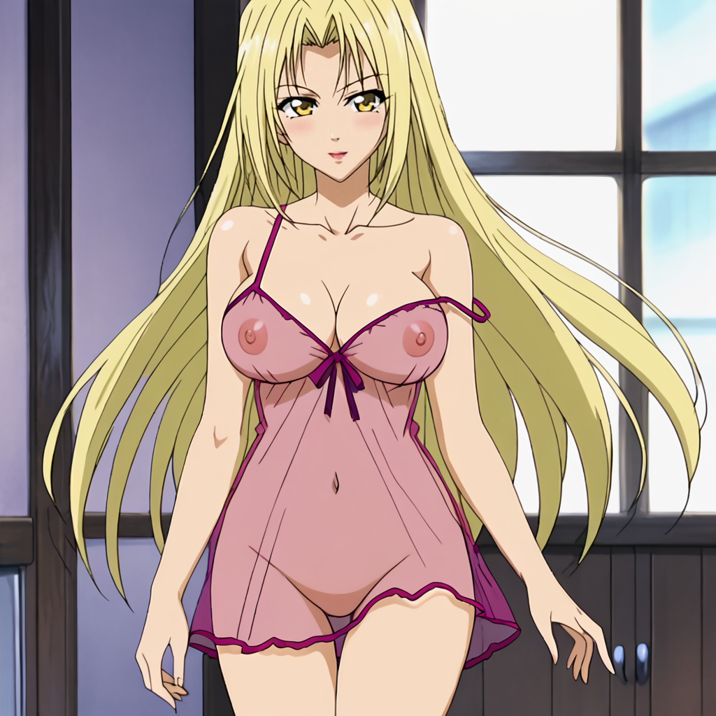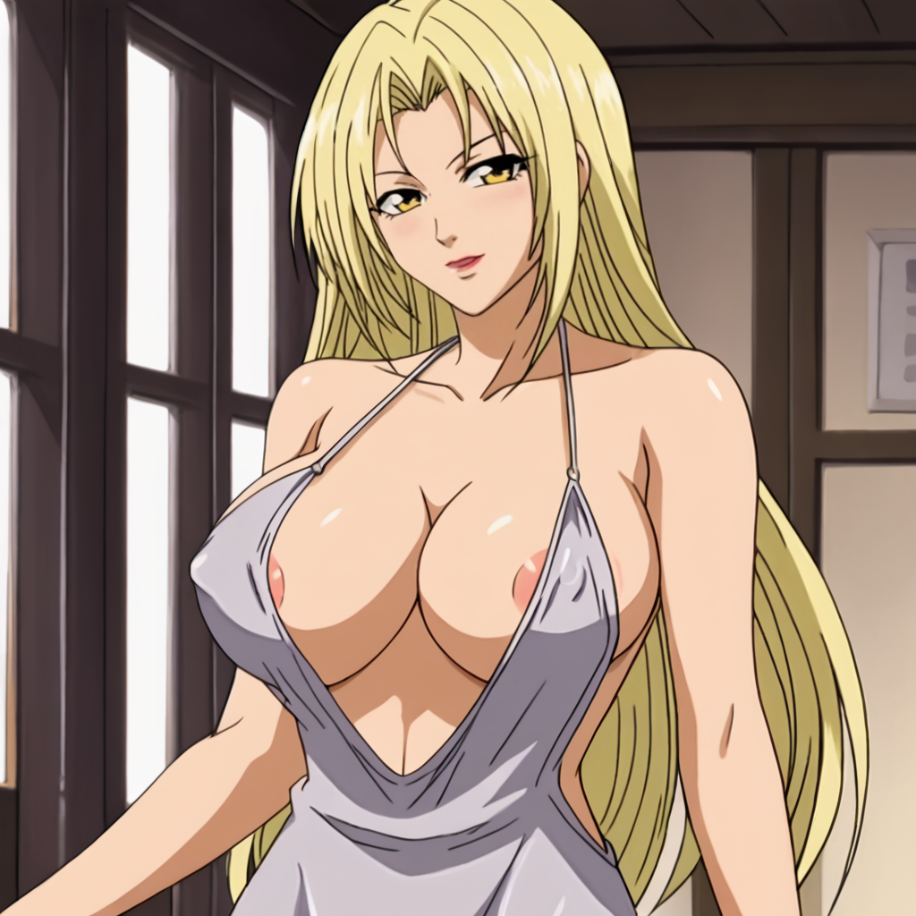 - 트리거: Hevn, 금발 머리, 큰 가슴, 긴 머리, 1girl, 복부, 벨트, 젖가슴 노출, 배꼽, 바지, 갈색 눈