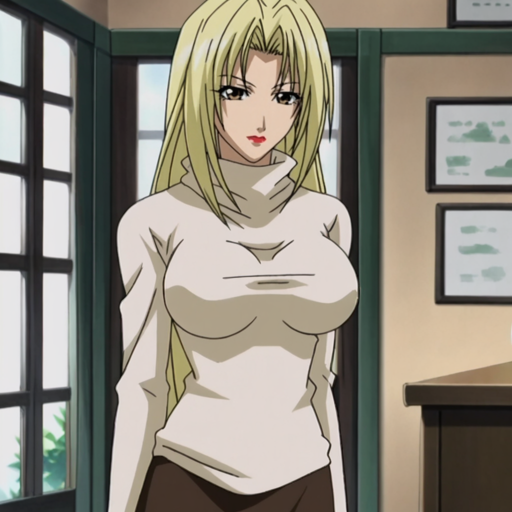 - 긴 스웨터 트리거: HevnLongSweater, 1girl, 금발 머리, 긴 머리, 터틀넥, 스웨터, 치마, 큰 가슴, 갈색 눈, 긴 소매, 립스틱, 메이크업, 카우보이 샷