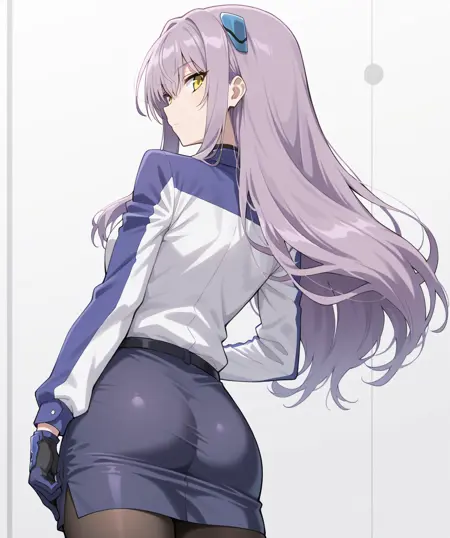 long sleeve shirt, loop tie, pencil skirt, hair ornament, gloves, black pantyhose, white shoes,