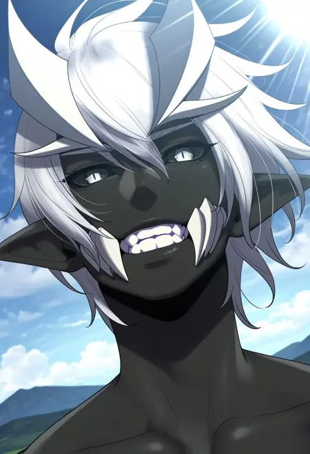 Ipos,尖耳朵,黑色皮肤,牙齿,白色角,黑色巩膜,白色眼珠,细长瞳孔,白色头发,